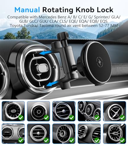 - Wilress Charger Holder for Car: ALAFLY adjustable car accessory magnetic phone mount is designed for round air vent with an inner diameter between 52-77 mm, compatible with Mercedes Benz A/ B/ C/ E/ G/ Sprinter/ GLA/ GLB/ GLC/ GLK/ CLA/ CLS/ EQE/ EQA/ EQB/ EQS, Toyota Tundra/ Tacoma, compatible with MagSafe ONLY for iPhone 17 16 15 14 13 12 Series and for Samsung S25 / S25 Plus / S25 Ultra with a magnetic case, [NOT compatible with Motorola, OnePlus and Google phones]. Please confirm your car and phone model before purchasing