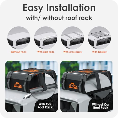 - [ Suitable for All vehicles ] BOYUJK roof bag is suitable for all cars with or without luggage racks, such as SUVs, vans, sedans, and jeeps. You can take your luggage to the park, beach, sports field, or anywhere you need storage, and it installs easily in minutes, no tools required. Our roof packs help you and your family enjoy a comfortable holiday.