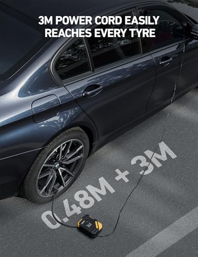 - [Extended Reach, Emergency LED Light] Featuring a 48cm hose and 3-meter power cord, this inflator easily accesses all tyres on your vehicle. The integrated LED light ensures visibility in emergencies or low-light conditions.