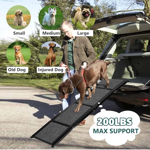 - Safety & High Stability – High grade aluminum ensures the dog ramp stairs more lightweight , he foldable dog car ladder weighs only 12 lbs, but strong enough and its mechanically designed structure provides strong support, making the dog ramp stable to support dogs up to 200lbs