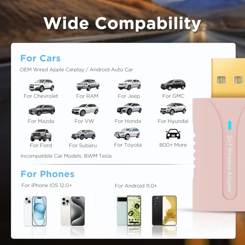 DYUZO CarPlay Android Auto Wireless Adapter, Mini 2in1 with Car Play Android Auto Cars Stick, Stability Automatic Connection for OEM Wired CarPlay Android Auto 2025 Upgrade, Pink