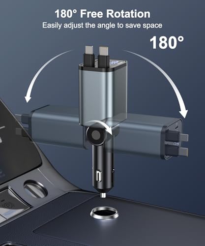 • Convenient & Tangle-Free Retractable Cable: This car phone charger is equipped with two 31.5-inch (80 cm) retractable cables, one for USB-C and one for iPhone. It not only effectively prevents cables from getting tangled, but also keeps the interior of your car tidy. When you are not using them, just gently pull the cables forward about 1 cm and then release them, and they will automatically retract, ensuring easy and convenient storage while creating an orderly in-car environment.