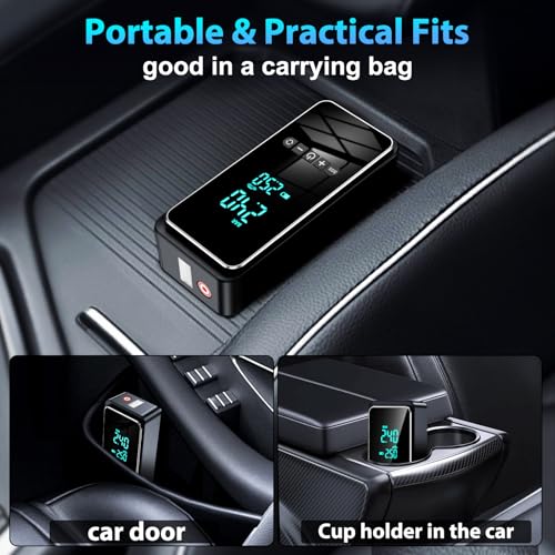 - 【Car Tyre Pump with Auto-Stop & LCD Display】The built-in sensor of this car tyre inflator can accurately measure tire pressure in real time, and say goodbye to the trouble of "pointer stuck" of traditional tyre pumps. The large LED screen ensures that the tire pressure value can be easily viewed even in bright sunlight. Once the target pressure is reached, it will automatically stop to avoid the danger of over-inflation. Whether you are new to electric bike pump or not, you can easily get started and use it safely.