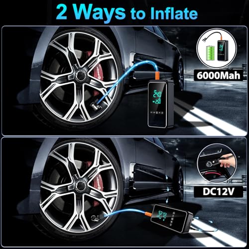 - 【Multi-Functional Emergency Tool】This car tyre inflator air compressor has a built-in LED light group including white light illumination, strobe warning, and red SOS mode, which provides a clear view when changing tires/maintenance at night, and can also send out a distress signal in an emergency. This air compressor tyre inflator has a built-in 6000mAh battery and USB port, which can provide emergency charging services for your mobile phone and other electronic devices at any time.