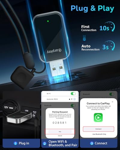 - Lightning-Fast Wireless Connection: This wireless Carplay adapter features a WiFi 6 5.8GHz and Bluetooth 5.3 dual-band chipset for improved performance, converting wired CarPlay to wireless in connects in just 10s and reconnects in 3s, ensuring enhanced stability and near-zero latency. Enjoy cable-free access to navigation, music, calls, and Siri. Eliminate messy cords and unlock seamless driving with full wireless freedom.