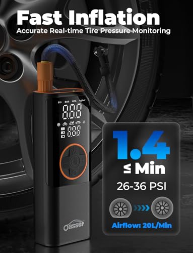 Oasser Tyre Inflator Air Compressor for Bikes & Cars – 150PSI, 6000mAh Battery with DC 3M Lighter, Portable Dual Display Pump with Auto Shut-Off & Storage Bag