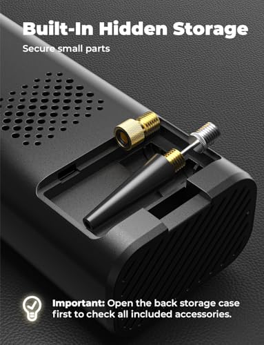 - 5. Versatile Applications: Beyond the standard nozzle, this portable tyre pump comes with 3 additional nozzles, conveniently stored within the air pump. It is designed elegantly and is easy to store. Perfect for inflating car tyres, sports, or recreational equipment, suitable for compact or mid-size cars, SUVs, bicycles, motorcycles, balls, and more.