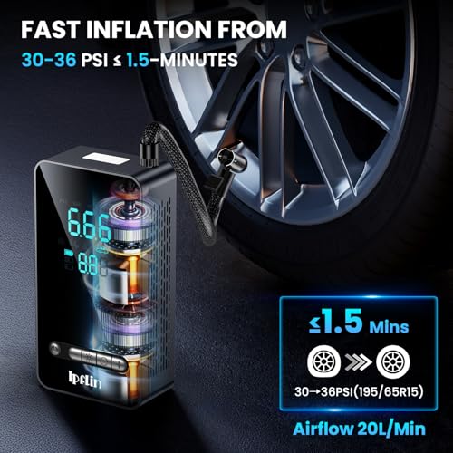 - Compact and Portable, Rapid Inflation This Ipflin tyre inflator measures 3.11*1.77*5.91 inches and weighs merely 0.88 lbs, making it easy to transport in confined spaces such as vehicles or bikes. This is a must-have accessory for cars, motorcycles, and bicycles during your rides. The tyre inflator can elevate the air pressure of 195/65R15 tyres from 30 PSI to 36 PSI in just 1.5 minutes.